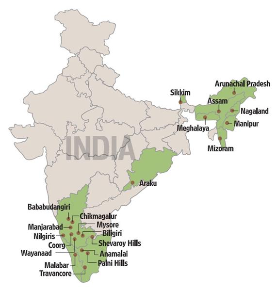 Based on region of production, 13 regional coffees are classified: Anamalais, Bababudangiris, Biligiris, Araku Valley, Brahmaputra, Shevaroys, and Pulneys (for Arabica) and Wayanaad and Travancore (for Robusta). Coorg, Chikmagalur, Nilgiris and Manjarabad are famous for both Arabica and Robusta.