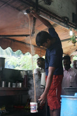 The vendor holds a jug high up in one hand with the cup down below in the other – a distance of over three. He pours the coffee into the cup, then back into the jug, then back into the cup - a couple of times of this back and froth, before he offers it to his customer.